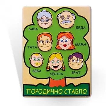 Drvena edukativna umetaljka na kojoj je potrebno postaviti odgovarajuću figuru koja predstavlja lik člana porodice.