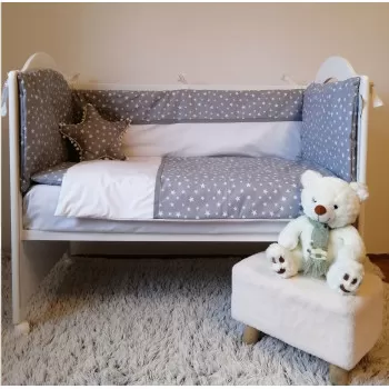 Posteljina Zvezdica proizvedena je od kvalitetnog 100% pamuka. Komplet sadrzi ogradice za tri strane krevetica, jorgan,jorgansku navlaku,carsav sa lastisem,ravan jastuk i ukrasni jastuk.